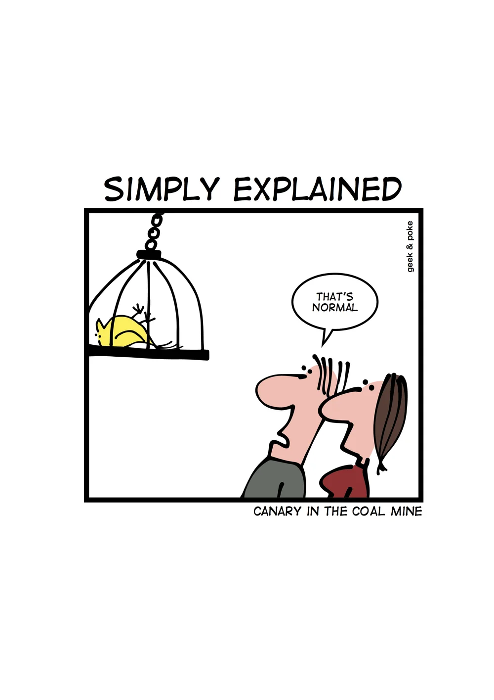 Canaries in a coal mine. Canary in athe coal mine. Refers to the former practice of taking caged canaries into coal mines. Canary Wharf - Canary.